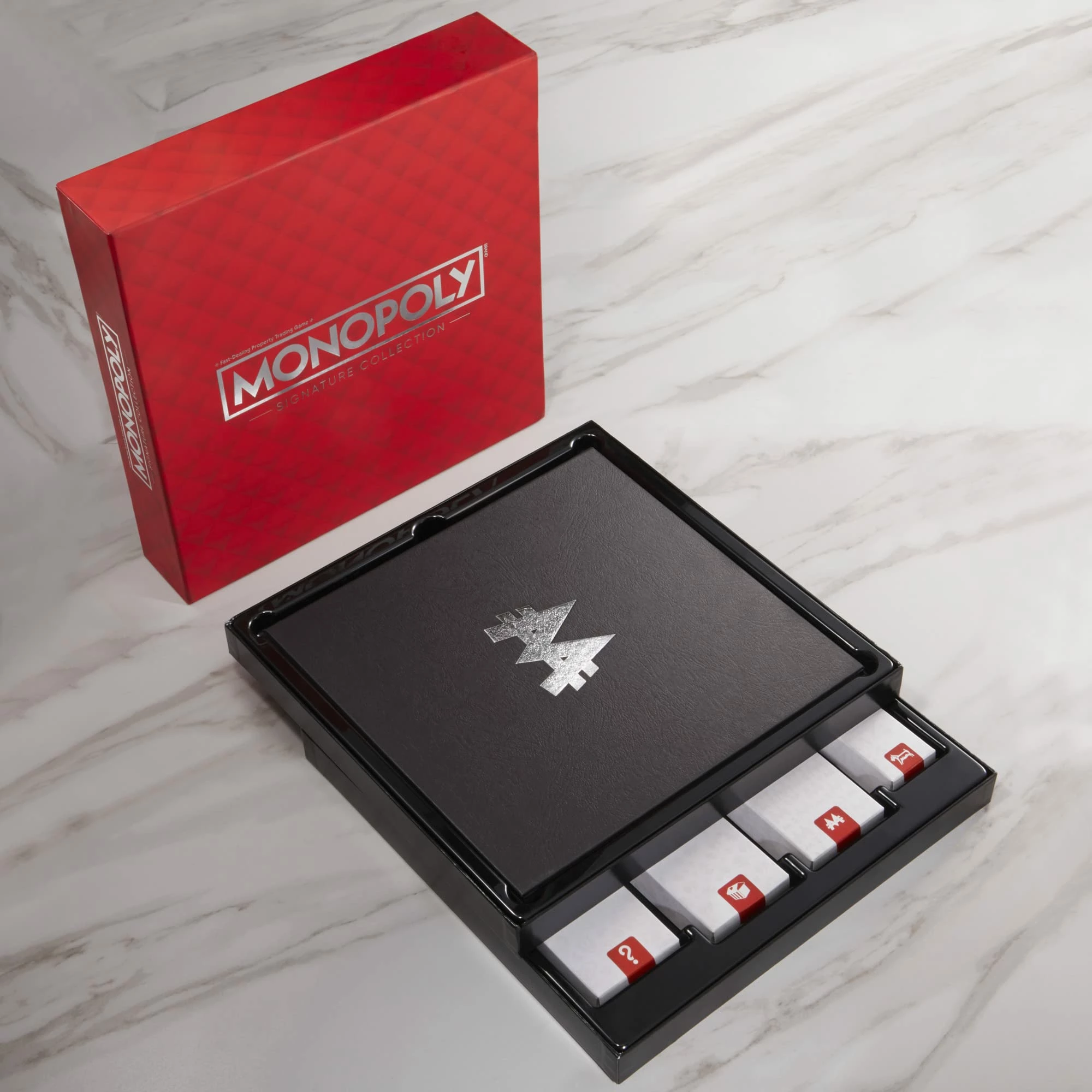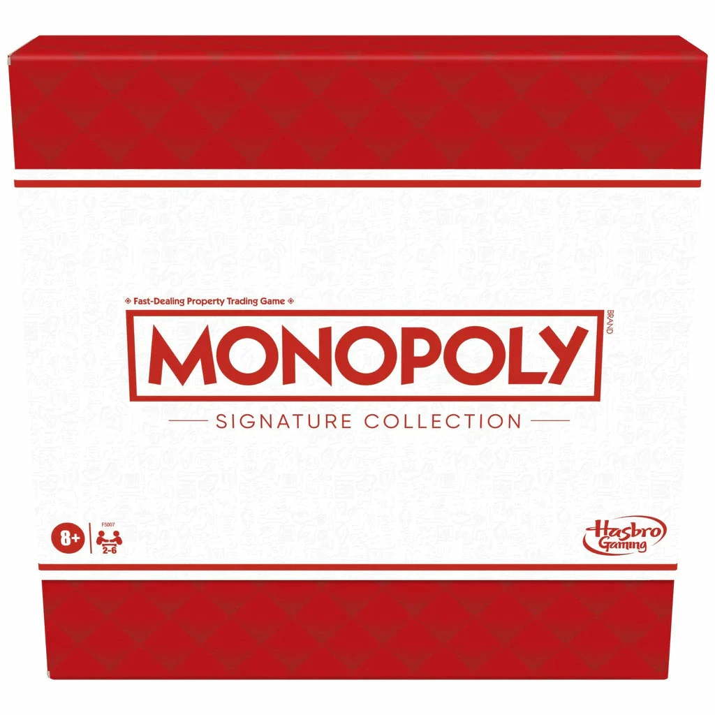 - Chase your fortune with this ready-to-display Monopoly Signature Collection board game! Roll the red dice to purchase properties, and raise rent with luxe Houses and Hotels. Players can arrange the foil-treated money in their own personal tray and move around the board with one of 8 red enamel Monopoly tokens. Chance and Community Chest cards may lead players down the path to bankruptcy so don’t get too comfortable! Accumulate wealth, test friendships, and create lifelong memories for generations to come. With classic Monopoly gameplay in a premium package, this collector’s edition of the Monopoly game makes a perfect gift for Monopoly fans ages 8 and up.