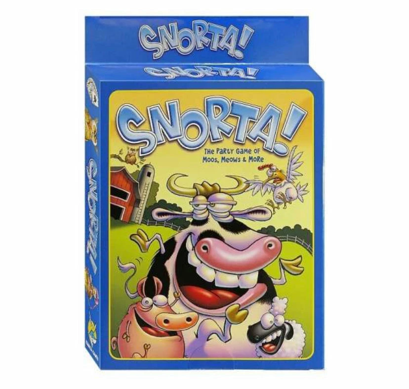 Snorta! The wild game of moos, meows, and more! The Party Game where everyone is an animal…or at least sounds like one! Get ready for laughter as your friends and family suddenly start sounding like they were born in a barn!”