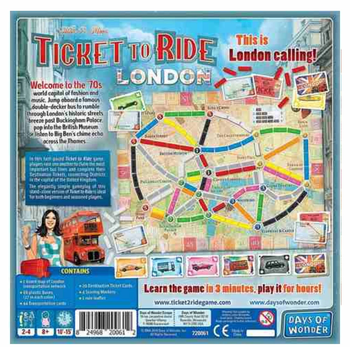 - Includes 1 board map of London transportation network, 68 plastic buses (17 in each colour), 44 transportation cards, 20 destination ticket cards, 4 scoring markers and 1 rule leaflet