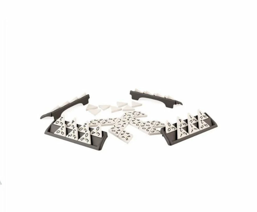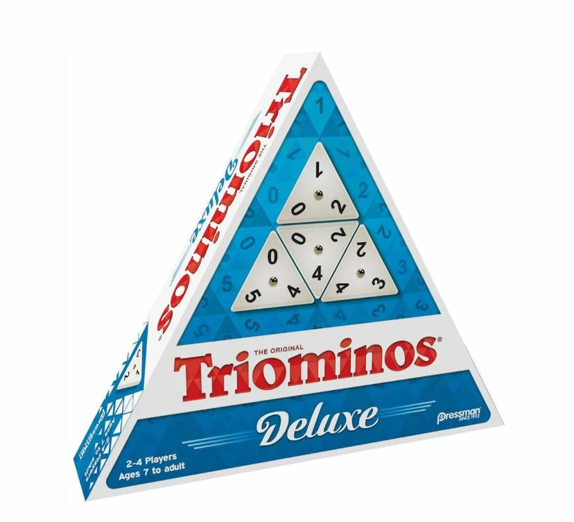 The classic triangular domino game! Score points by matching numbers on the three-sided pieces. Tri-Ominos Deluxe playing pieces are crystalline with brass spinners. Keep everything together in triangular box. Score points based on the numbered tiles you are able to play and score big with bridges and hexagons! Be the first player to score 400 points to win. For 2-4 players, ages 8 and up.