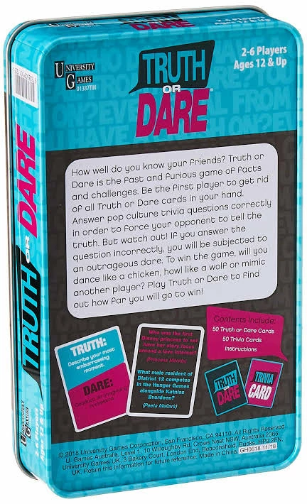The Truth or Dare Game in Tin is a super exciting game to play with friends! … This card game comes with 50 Truth or Dare Cards as well as 50 Trivia Cards that put a twist on the normal Truth or Dare. The goal of this game is for players to race one another in getting rid of all their cards.