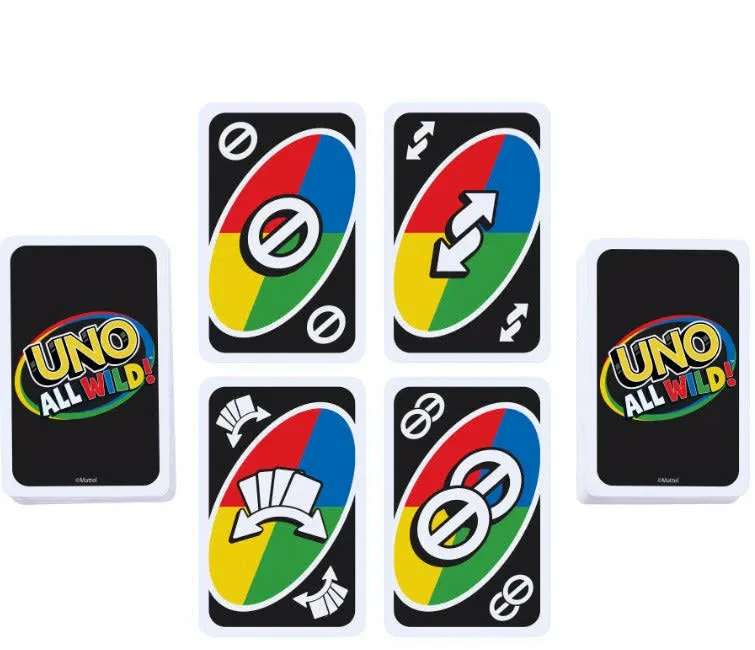 In UNO All Wild card game, every single card is wild for a fast-paced, even more unpredictable version of this family favorite! There’s no matching of number or color like regular UNO, but it’s not as easy as it sounds.